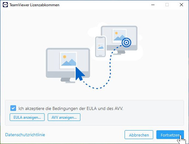 - Ein weiteres Fenster öffnet sich, bei dem Sie die Bedingungen der EULA und AVV zulassen